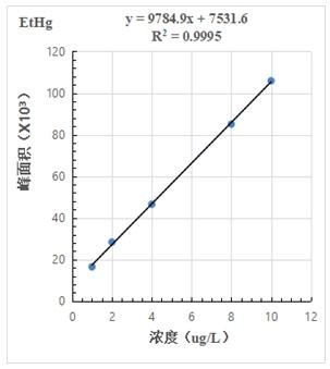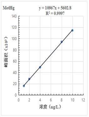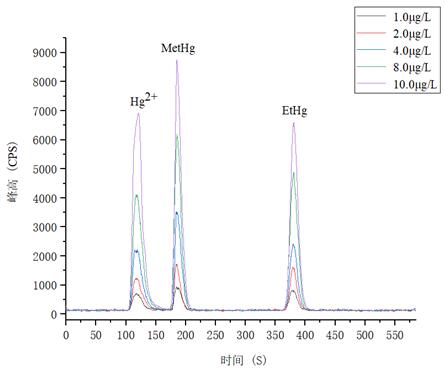 1.0µg/L、2.0.µg/L、4.0µg/L、8.0µg/L、10.0µg/L 汞形态混合标准溶液分离色图谱如图3所示,其中无机汞(Hg2+)、甲基汞(MetHg)、乙基汞(EtHg)相对保留时间分别为118s、185s、379s,从谱图叠加图上可以看出,三种汞形态出峰时间稳定,且分离度较好。