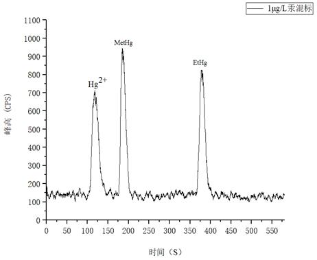 如图4所示为1.0µg/L汞形态混和标准溶液分离图谱,以各形态峰附近基线处的3倍信噪比(S/N)峰高对应的浓度作为检出限,溶液中Hg2+、MetHg、EtHg分别为0.112µg/L、0.0718µg/L、0.0698µg/L。