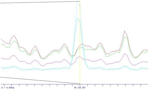 按照其ICP小软件谱线库带来很多金属金属属性各个谱线,先要取舍被测金属金属属性灵敏性性强 的谱线,二、考量不在原材料基体及被测金属金属属性双方直接抑制小的谱线的条件,取舍进行分析线如下图所示。