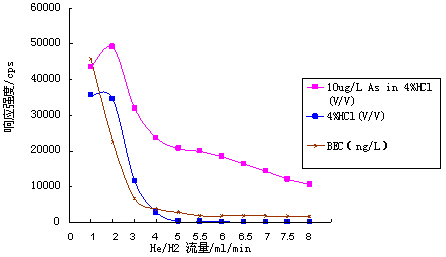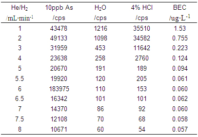 🀅 仪器首先在标准模式下进行参数优化(利用10μg·L-1的Li、Co、In、U、Ce调谐液对仪器工作参数进行调节,使仪器灵敏度高,同时氧化物及双电荷产率小于3%);再开启He/H2碰撞反应气,逐步增大He/H2流量,测试超纯水、4%HCl及10μg·L-1 As(4%HCl介质)在75amu处的响应信号,计算其背景等效浓度(详细数据见表1及图1);并利用As标液进一步优化He/H2流量,得到仪器工作参数如表2所示。