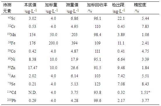 🃏 在仪器优化工作参数条件下,对样品溶液及加标样液进行测试,计算其加标回收率;对样品空白溶液平行测定7次,以三倍空白信号标准偏差/灵敏度对应的浓度为检出限;同时对样品溶液平行测定11次(间隔2min),计算其相对标准偏差,考察精密度,数据见表4。各元素检出限在0.41-22.07ng/L之间,加标回收率在93.82%-123.10%之间,精密度在1.06%-8.43%之间。